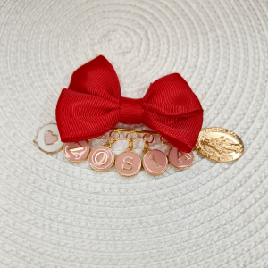 Agrafka wykonana jest ze złotej agrafki oraz złotych literek na różowym tle. W cenie agrafki są 2 dodatki do wyboru oraz kolor kokardy.