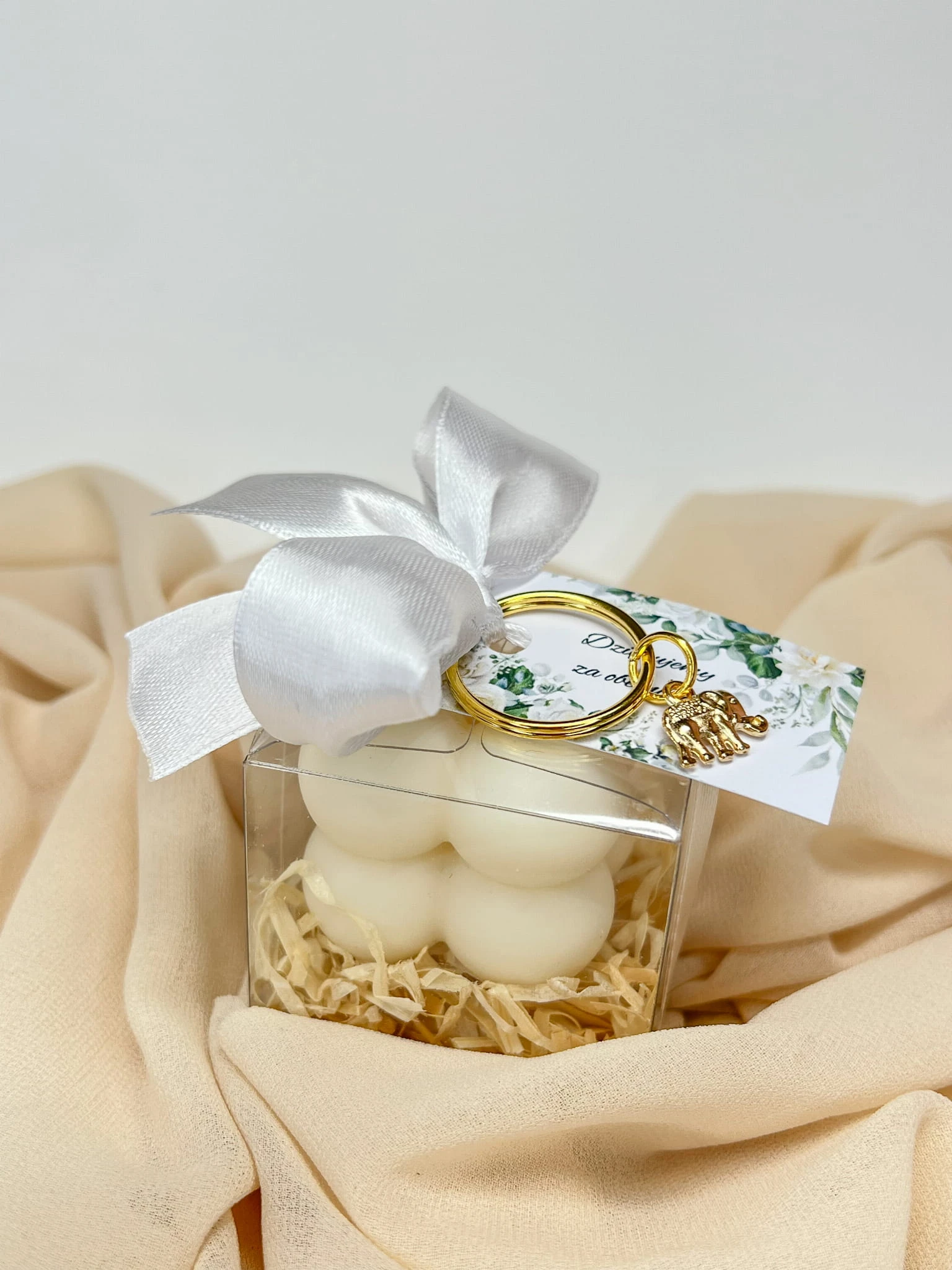 Świeca sojowa mini bubble w pudełeczku z brelokiem słonikiem - Podziękowanie dla gości