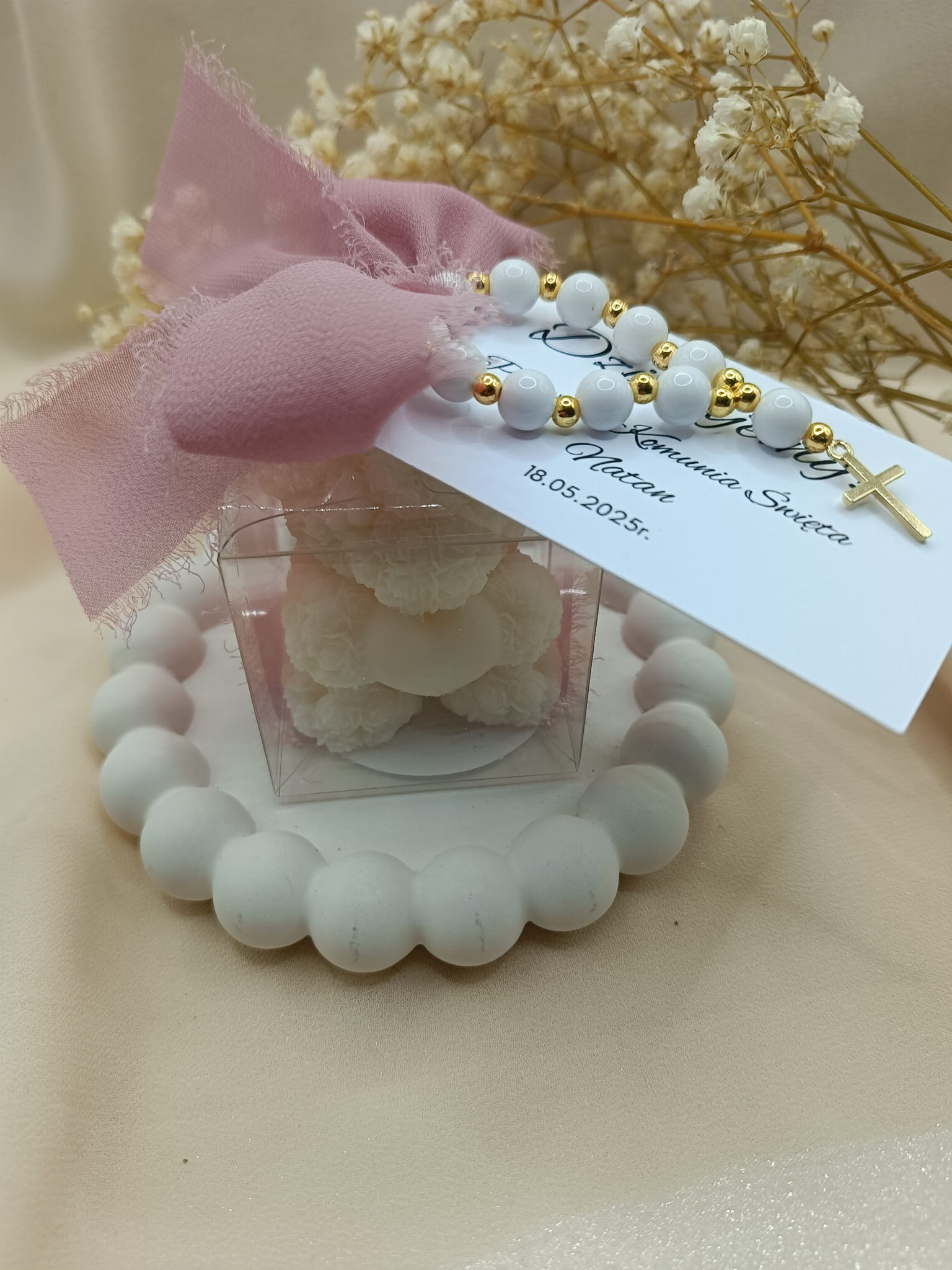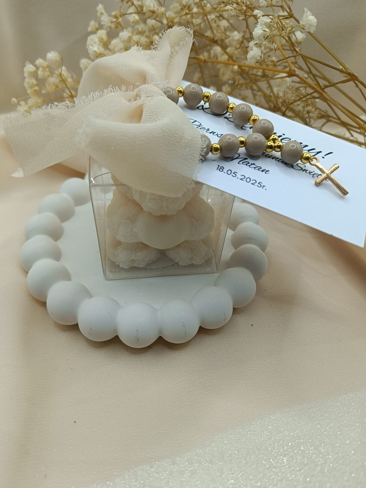 Świeca z różańcem miś - Podziękowanie na Pierwszą Komunię Świętą, Chrzest