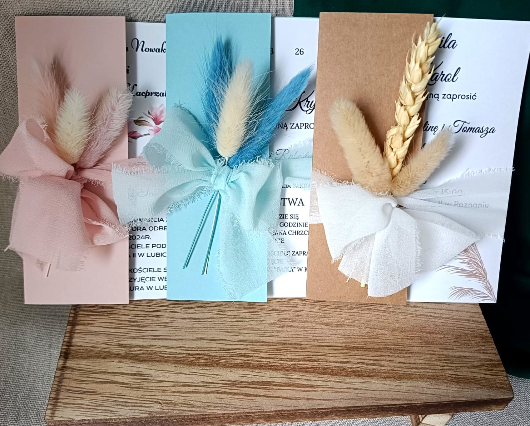 Jeśli szukasz prostych, a zarazem eleganckich zaproszeń na wyjątkową okazję, nasze zaproszenia ślubne z kolorową bazą, wstążką szyfonową i suszkami będą idealnym wyborem. To minimalistyczna forma zaproszenia, która łączy estetykę, praktyczność i możliwość personalizacji.